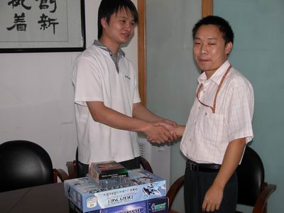 2004年9月27日,也是中秋的前夕,百年奧運(yùn)競猜活動的重磅人物--特等獎得主曹而先生終于亮相商科集團(tuán),領(lǐng)走了他的頭等大獎(碩泰克K8+銘瑄5700ultra+AMD Athlon64 3000+cpu)一共價值現(xiàn)金5000元。