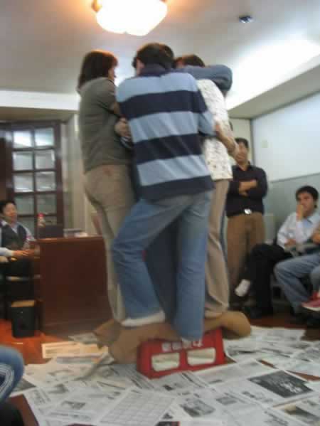 “抱團打天下”游戲:7人合力站在小小的啤酒箱上,堅持1分鐘以上才算過關。此游戲可以訓練團隊合作精神,考驗意志力和增強組員的相互協調與團結能力。
