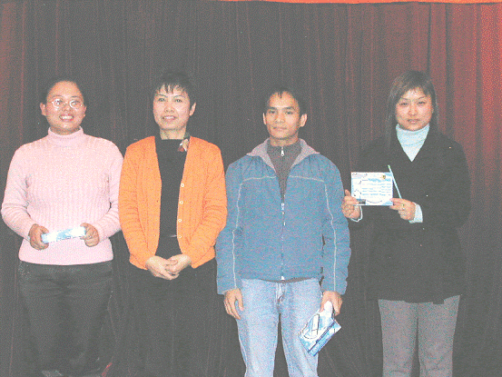 門市經理王穎輝為獲得三等獎的三位同事頒發獎品并留影