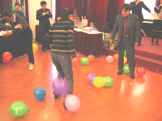 《踩氣球》2人/組*4組:每人左右腳上各綁四個氣球,互相踩對手的氣球,最后以破得最少者為勝。對手們是虎視眈眈,瞄準目標就上。