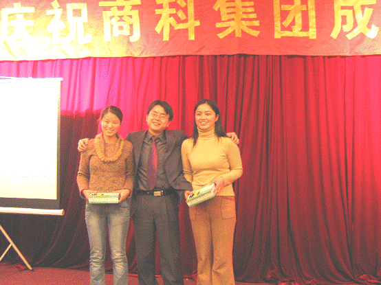 上海分公司員工呂家起正在接受孫經理頒發的“銷售標兵”這個榮譽稱號