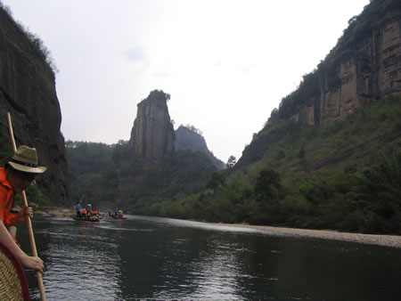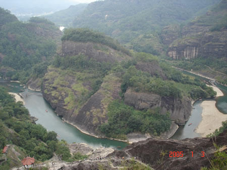 武夷山風景區東西寬約5公里,南北長約14公里,面積60平方公里。有九曲溪、溪南、水簾洞、碧石巖、桃源洞、三仰峰、武夷宮、云窩等景點,屬典型的丹霞地 貌,素有“碧水丹山”、“奇秀甲東南”之美譽,是首批國家級重點風景名勝區之一,被國際旅游組織執委會主席巴爾科夫人稱為“世界環境保護的典范”。武夷山是《洞天福地記》(杜光庭)里的三十六洞天之一。“三三秀 水清如玉,六六奇峰翠插天”,構成了奇幻百出的武夷山水之勝。“溪曲三三水,山環六六峰”,“曲曲山回轉,峰峰水抱流”﹔臨水可觀山景,登山可望水秀,乘上一 葉竹筏游覽世間一絕的九曲溪,順流而下,山沿水立,水隨山轉,山光水色,交相輝 映,三十六峰、九十九巖一覽無余,其間更有距今約3800年前高插于懸崖峭壁之上的 船棺,令人嘆為觀止.....