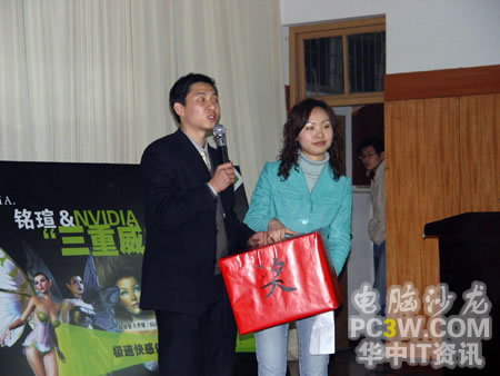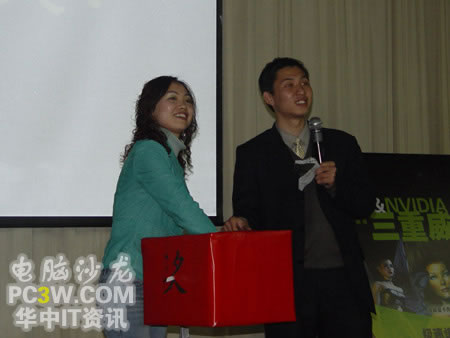 壓軸大獎即將揭幕,商科集團武漢天行電腦總經理徐進先生親自抽取了本次活動的一等獎。在抽出一等獎后,他還激動的表示,特別設立一個特等獎,將一塊NF4 SLI的主板作為特別獎勵,由獲得一等獎的這位MM抽出。