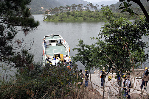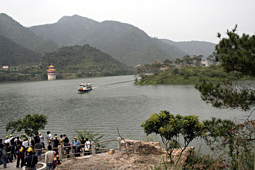 同事們信步沿著湖堤來到游船碼頭,乘坐游船游覽九龍湖庫區(qū),此時(shí)陰云已久的天空漏出少許陽光,正是游湖的大好時(shí)機(jī)。