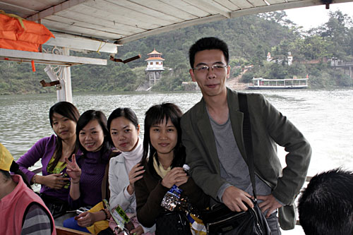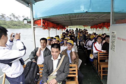 首先進(jìn)行的項(xiàng)目是游覽九龍湖,大家依次登上游船后,開始了輕松的路程。能搭載98人的大型游船滿載著商科全體員工向湖區(qū)深處行駛而去,大家一邊飽覽湖區(qū)美景,一邊悠閑的聊天或分發(fā)零食。游船引擎激起層層浪花向湖邊散去,湖岸上森林茂盛,郁郁蔥蔥,富含氧氣的清新空氣讓大家心情都很舒暢,雖然12月歷法上已經(jīng)進(jìn)入冬季,不過在廣州依然是初秋的氣息,湖上也刮起略帶涼意的秋風(fēng),但大家的興致依舊高昂。