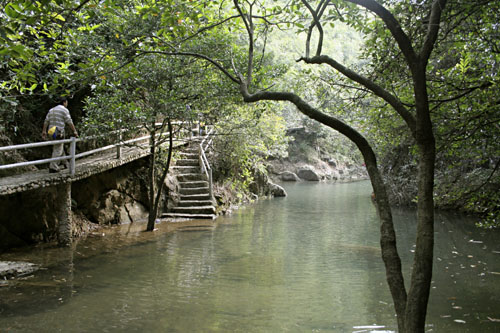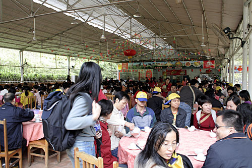 在乘船游覽了美麗的九龍湖后,游船停靠在湖深處的岸邊,這里是通過鼎湖山溯溪探險(xiǎn)的起點(diǎn),由于大家已經(jīng)乘車乘船不少時(shí)間了,也都饑腸轆轆了。不過不用擔(dān)心,導(dǎo)游已經(jīng)安排好了,同事們一起來到湖邊的露天餐廳用餐,這里雖沒法和酒店賓館相提并論,但濃郁的鄉(xiāng)野氣息也別有一番情趣。