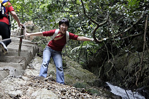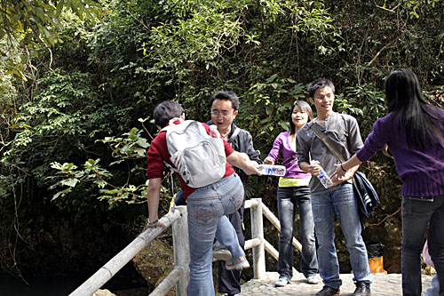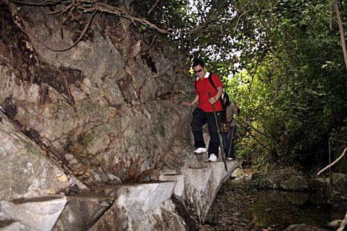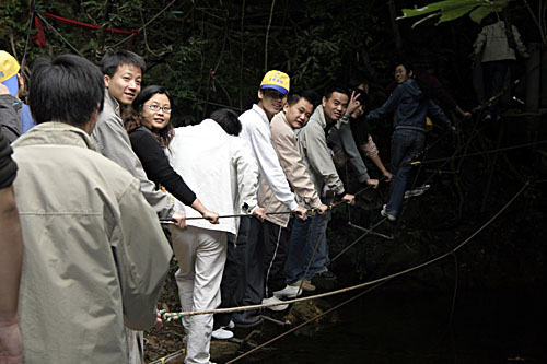 說起探險(xiǎn)大家并不陌生,但沿著小溪逆流而上仍別有一番風(fēng)情,這里的小溪清澈見底,氣石林立,引起大家一致的贊嘆。溪水邊還生長著茂密的竹林和樹木,同事們沿著小徑拾級(jí)而上,去尋找溪水的源頭,中間當(dāng)然也有很多驚險(xiǎn)的獨(dú)木橋和鋼絲索道,大家互相幫助,談笑風(fēng)生,路途有驚無險(xiǎn)。