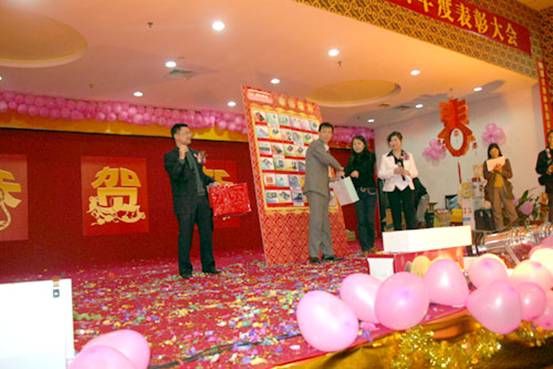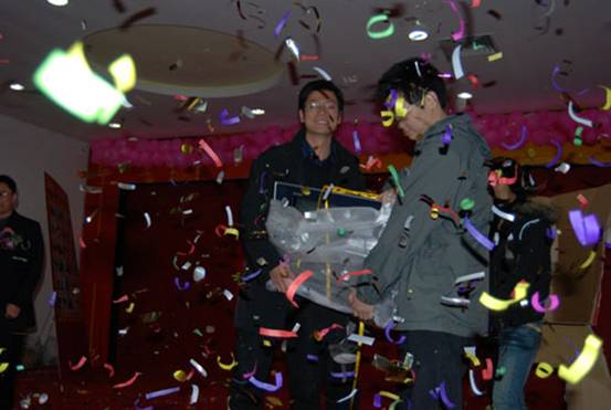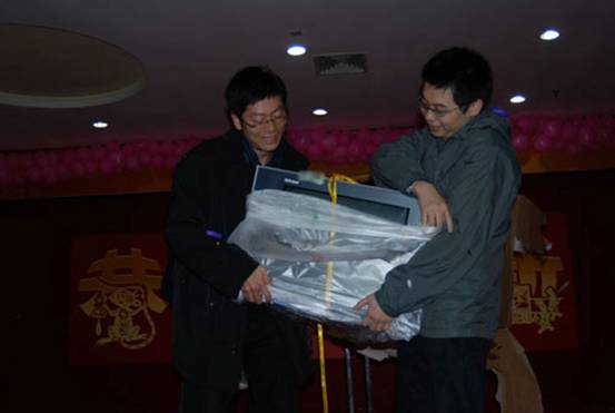 在抽獎(jiǎng)晚會(huì)的最后,工作人員特別準(zhǔn)備了一份神秘的獎(jiǎng)品,有全體與會(huì)人員共同參與。這份神秘的禮物是什么呢?到底會(huì)花落誰(shuí)家呢?在同事的驚喜聲中,來(lái)自臺(tái)電數(shù)碼事業(yè)部的一位同事贏得這個(gè)神秘的全場(chǎng)特別大獎(jiǎng)。