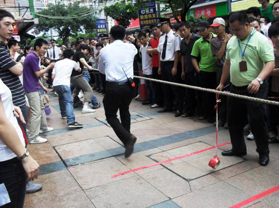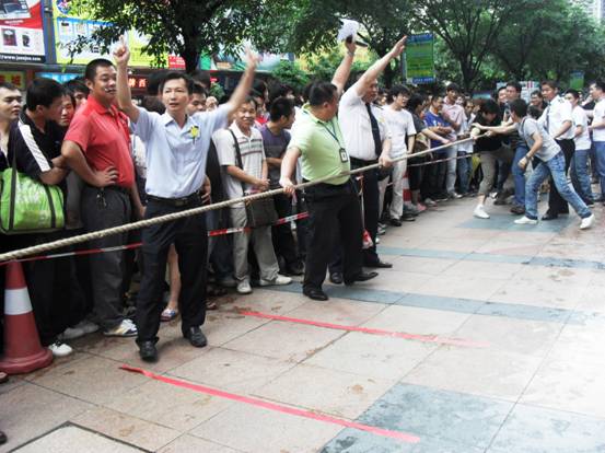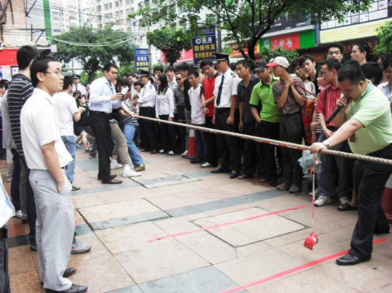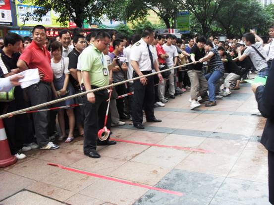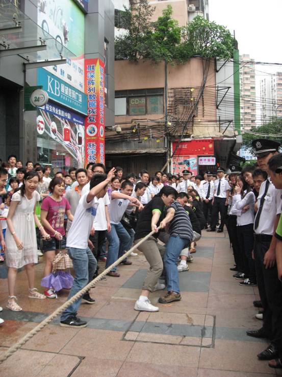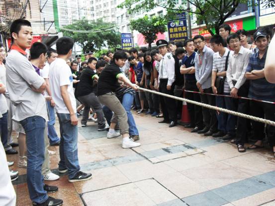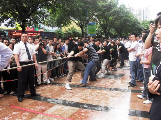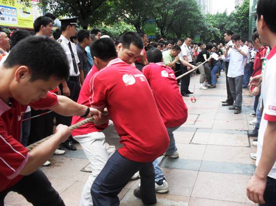 加油加油加油,,隊(duì)員們連吃奶的力都使上了,標(biāo)志帶向前移動(dòng)一下,眼看就要被拉過(guò)去了,但每一個(gè)人都沒(méi)有放棄,使出全身力量,拉拉隊(duì)的聲音早就沖過(guò)云宵,叫喊聲響成一片,每個(gè)人都快瘋掉。只見(jiàn)秦明和盧健華兩位份量級(jí)的人物向后一倒,倒在地上,紅色標(biāo)記帶隨著這一拉,越過(guò)紅線,大家跳了起來(lái),第一局,贏啦!