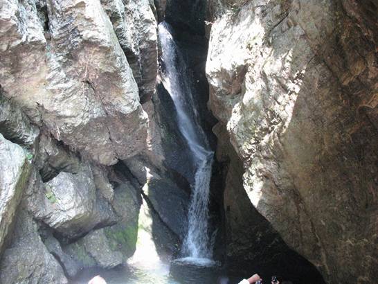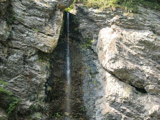一線瀑 前行數(shù)米,老遠(yuǎn)就聽見驚天動(dòng)地的“雷”聲,走近了才知那瀑布隱藏在一個(gè)巨大的石洞內(nèi),像龍嘴里吐出的白練,故稱之為龍喉瀑,上游之水如游龍一般通過一個(gè)跌巖穿入一個(gè)石縫,在石縫窟窿里形成一個(gè)“之”字形瀑布,因有石洞包圍,垂落下來時(shí),其聲如虎狼咆哮,真是壯觀和驚心動(dòng)魄。