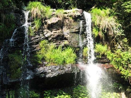 沿著曲折的棧道,我們難得看到兩支瀑布一大一小在同一巖石上傾注,猶如夫妻朝夕相伴,夫妻瀑布是也。 景致最美的是小黃果樹瀑布,瀑高20余米,瀑寬約15米,貼石壁傾斜而下,水勢(shì)滔滔,水流飛泄時(shí),因碰撞凹凸不平山巖而產(chǎn)生水花四濺,飛飛揚(yáng)揚(yáng),猶如大霧彌漫,雄渾瑰麗。