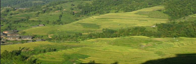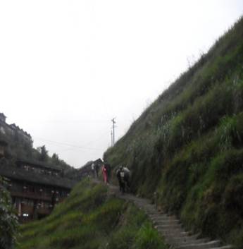 龍脊梯田區(qū)域內(nèi)最高海拔880米,最低海拔380米,坡度大多在26-35度之間,最大坡度達(dá)50度。汽車在窄小崎嶇的鄉(xiāng)村公路上盤旋,之字形的急轉(zhuǎn)彎繞過了一個(gè)又一個(gè),汽車負(fù)重爬坡的吼叫一陣又一陣,七十二道彎在蒼翠的山坡上掛上了九曲回腸,那碧綠清徹的溪流便漸漸遠(yuǎn)離而去。一路相伴的只有層層疊疊的梯田,往下看,一個(gè)個(gè)山峰酷如裝滿米谷的糧囤,那梯田就象蘆席編制的圍圈一個(gè)勁地往上竄;抬頭望,那層層越越的梯田如同見風(fēng)旺燃的火焰,跳動(dòng)著,盤旋著,仿佛要把美麗送上云天。從停車場到平安寨還有二十來分鐘的路程;蛟S是要考驗(yàn)梯田“朝圣者”的虔誠,那山路更顯得崎嶇險(xiǎn)峻。開頭的一段還是略帶坡度的水泥路,寬闊,平緩,又有溪流“叮咚”相伴。一過了那座蓋著風(fēng)雨廊的橋亭,能插足的就只有巖縫草間。