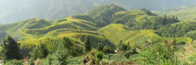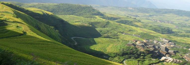 龍脊梯田之所以出名,就在于它的恢宏磅礴的氣勢(shì)。梯田如鏈似帶,從山腳盤繞到山頂,垂直落差達(dá)500米,小山如螺,大山似塔,層層疊疊,高低 錯(cuò)落。