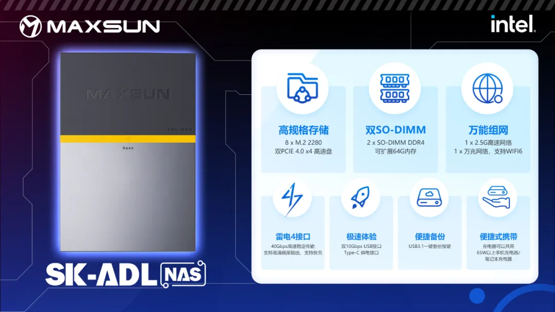 MS-ADL NAS作為一款8盤位M.2便捷式的NAS整機(jī)設(shè)計(jì),搭配全金屬外殼,簡約時(shí)尚風(fēng)格;整機(jī)搭配I3-1215U,雙PCIE 4.0X4高速盤,多場景流暢使用;雙SO-DDR4,1*2.5G+1*萬兆超高速網(wǎng)口支持超高速上傳下載。整機(jī)支持雷電四接口,雙10Gbps USB高速體驗(yàn),以及支持USB3.1一鍵備份按鍵。