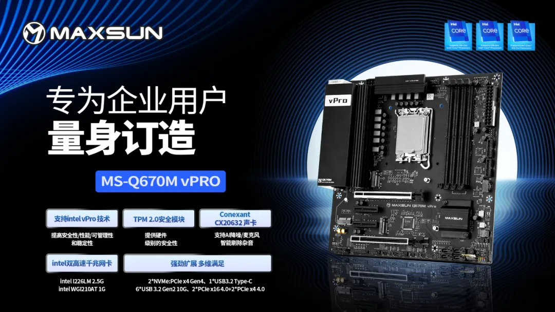 專為企業(yè)用戶量身訂造的Q系列vPro主板——MS-Q670M vPRO,搭配Q670芯片組,支持intel12/13/14代CPU;強(qiáng)勁擴(kuò)展,支持13個(gè)USB接口(6*USB3.2Gen2 10G+1*USB3.2 Type-C+2*USB3.2 Gen1+4*USB2.0);支持1*Pcie 5.0x16+1*Pcie 4.0x4(x16 slot)+1*Pcie 4.0 x4+1*Pcie 3.0;搭配intel 雙高速千兆網(wǎng)卡,支持雙M.2 NVME,多顯示方案,雙HDMI+雙DP。