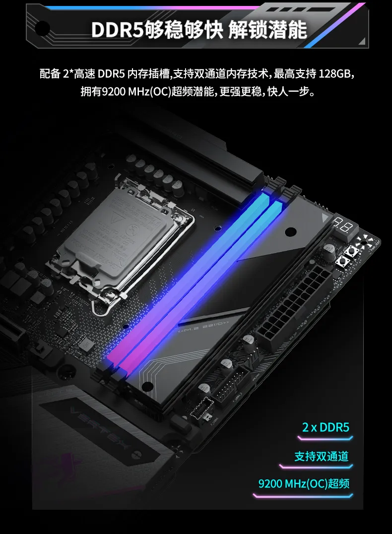 MS-iCraft Z890 Vertex(珠峰)板載銳影屏+超頻特化,同時(shí)擁有2xThunderbolt™ 4,高達(dá)9個(gè)USB 10G接口,PCIE5.0 x16顯卡插槽+PCIE5.0 x4 M.2接口,支持PCIE5.0通道拆分,2*SFF-8654 4i拓展接口,盡顯旗艦實(shí)力。
