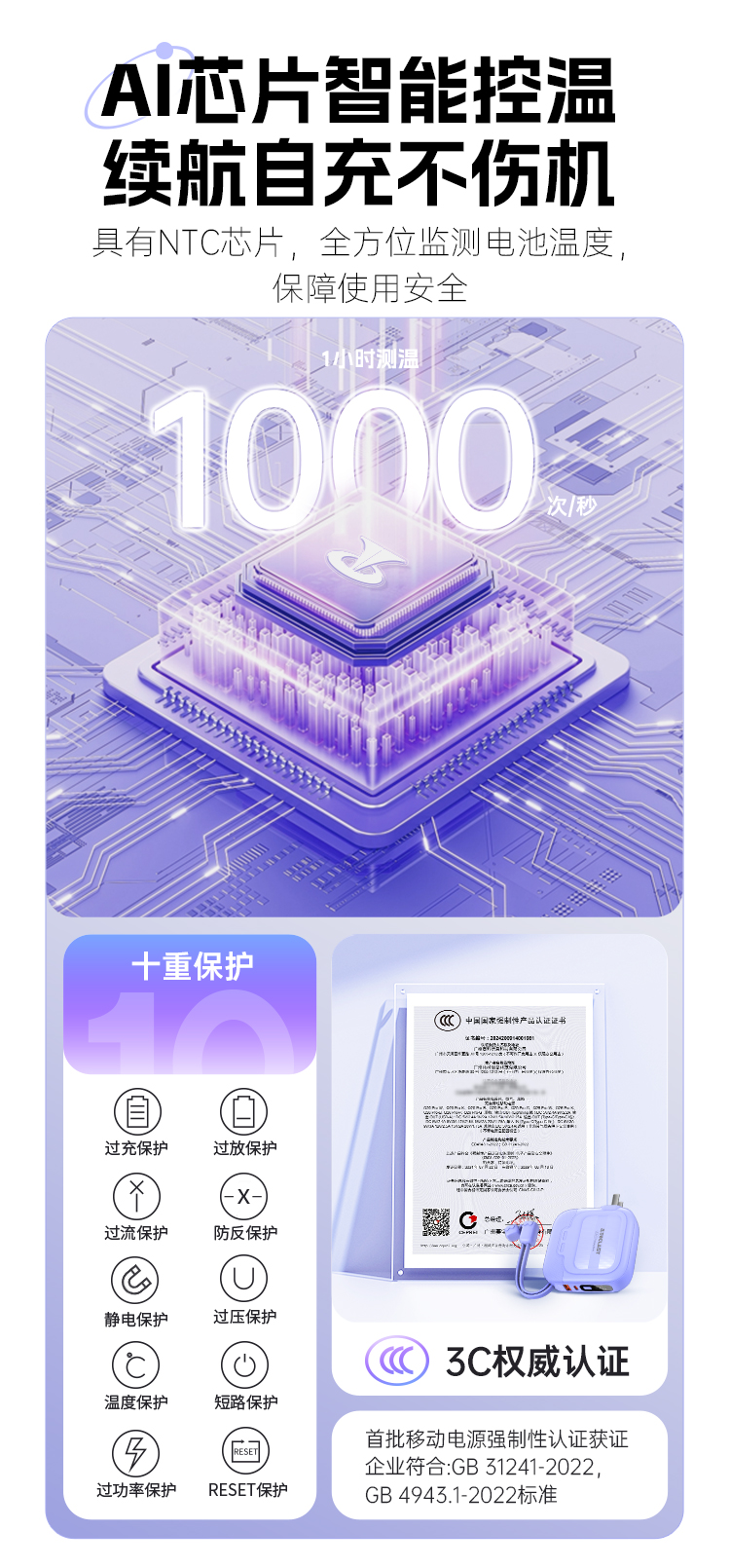 這款充電寶最大的亮點(diǎn)在于其自帶插頭和雙線的設(shè)計(jì)。無(wú)需攜帶額外的充電線和插頭,直接插入插座即可為充電寶本身充電,同時(shí)也能為其他設(shè)備充電。這樣的設(shè)計(jì)極大地簡(jiǎn)化了充電過(guò)程,讓您的和背包行李箱不再被各種充電線纏繞,真正實(shí)現(xiàn)了“一寶在手,充電無(wú)憂”。