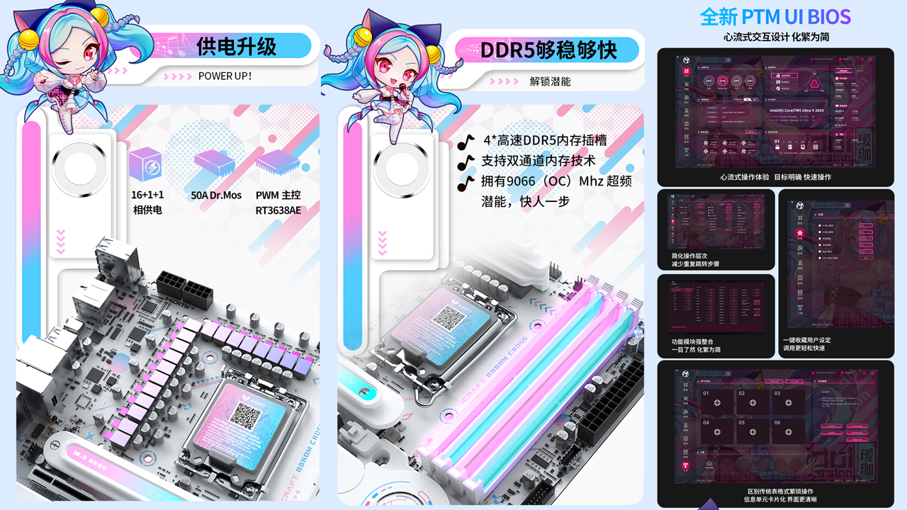 硬核玩家看重的性能,這款主板同樣毫不妥協。16+1+1 相供電設計搭配核心供電 50A Dr.Mos,強悍的供電能力足以輕松駕馭英特爾 ® 酷睿™ Ultra 9 處理器 285K,即便在《戰地 6》滿負載運行時,也能保持穩定輸出,避免因供電不足導致的卡頓、掉幀。4 條雙通道DIMM的DDR5內存插槽經過優化線路布局,擁有 9066(OC)Mhz 的超頻潛能,玩家只需通過銘瑄 PTM UI 圖形化 BIOS,幾步簡單操作就能調整供電參數、拉滿內存頻率,輕松為《戰地6》優化整機性能,小白也能輕松上手。