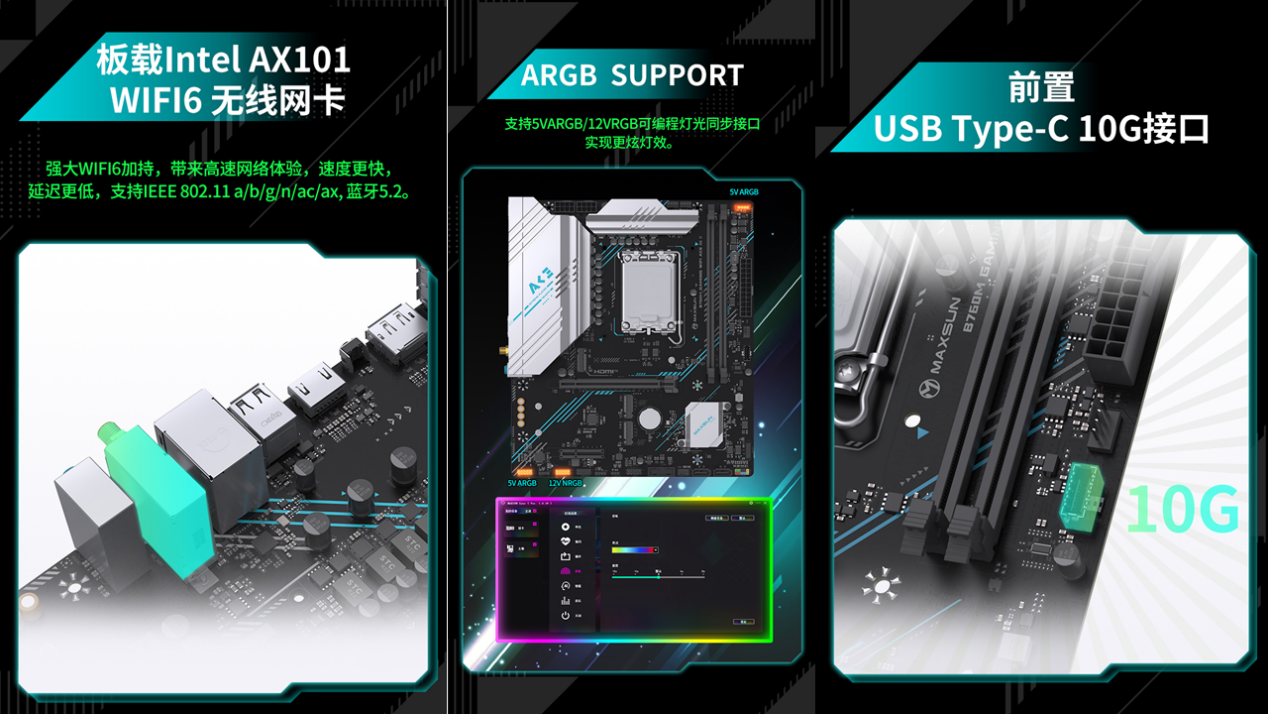 接口配置更是貼心又全面,后置IO接口豐富多樣,涵蓋 DP 1.2、HDMI 1.4 視頻接口,輕松支持 4K 高清輸出,滿足影音娛樂需求;同時(shí)配備 2 個(gè) USB 5G 接口、6 個(gè) USB 2.0 接口,足以連接鍵盤、鼠標(biāo)、硬盤等各類外設(shè)。更值得一提的是,主板貼心配備背部 CMOS 一鍵重置按鈕,無(wú)需開蓋即可快速恢復(fù) BIOS 設(shè)置,輕松解決超頻失誤等突發(fā)問(wèn)題;分布式 DEBUG 燈則能幫助用戶快速定位主板故障,排查問(wèn)題更高效。前置接口同樣給力,提供 10Gbps 速率 Type-C 接口與 5Gbps USB 接口,適配高速外設(shè)接入;支持 5V ARGB/12V RGB 可編程燈光同步接口,搭配 MAXSUN SYNC 燈控軟件,玩家可自由打造個(gè)性化光效主機(jī),讓顏值與性能并存。