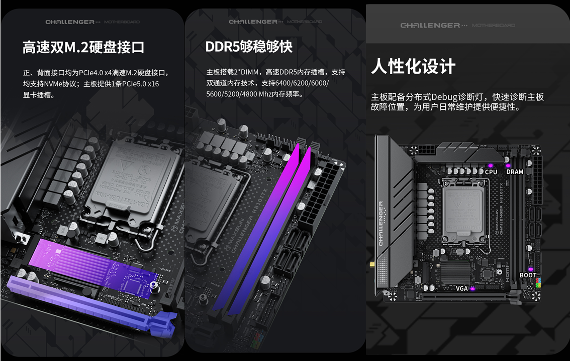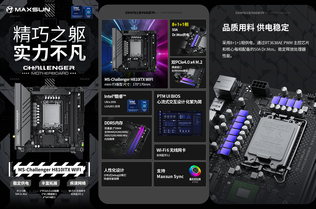 想要發(fā)揮處理器性能、連接各類硬件,一款適配性強(qiáng)、功能全面的主板至關(guān)重要。銘瑄Challenger H810ITX WIFI主板專為緊湊型主機(jī)設(shè)計(jì),17cm×17cm的標(biāo)準(zhǔn)ITX 版型,能輕松裝入市面上絕大多數(shù)迷你機(jī)箱,同時(shí)在供電、拓展、穩(wěn)定性上毫不妥協(xié),堪稱“小而全”的典范。這款主板采用8+1+1相供電設(shè)計(jì),搭配RT3638AE PWM主控芯片與每相 50A Dr.Mos ,供電電流穩(wěn)定且供電能力充足。即便處理器處于高負(fù)載運(yùn)行狀態(tài),也能持續(xù)提供穩(wěn)定電力,避免因供電不足導(dǎo)致的性能波動(dòng),能充分釋放英特爾酷睿Ultra 5 230F處理器的性能。