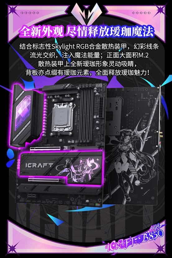 銘瑄iCraft B850 AIGA主板在設(shè)計上富有巧思,將二次元美學(xué)與硬核硬件完美融合,標志性的“璦珈”IP元素貫穿始終,自帶超高視覺辨識度,戳中年輕學(xué)生黨的審美偏好。標志性的 Skylight RGB 合金散熱裝甲,凌厲的金屬質(zhì)感之上,幻彩 RGB 線條如流光般交織流轉(zhuǎn),仿佛注入了靈動的魔法能量,隨呼吸燈效變幻出萬千色彩,為機箱內(nèi)部營造出沉浸感的光影氛圍。主板正面大面積的 M.2 散熱裝甲上,全新設(shè)計的璦珈形象靈動吸睛,背板處也巧妙點綴著同款元素,從正面到背面,每一處細節(jié)都在釋放獨特的 “璦珈魔法”,讓二次元愛好者一眼淪陷。