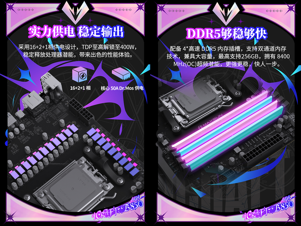 AMD 銳龍7 9700X處理器作為銳龍9000系列的中堅主力,配備8核16線程的強悍規(guī)格,至高5.5GHz的加速頻率帶來澎湃動力,同時在性能與能效之間做到出色平衡,無論是專業(yè)學(xué)習(xí)中的建模、編碼、視頻剪輯,還是暢玩各類 3A 大作,都能輕松勝任,是學(xué)生黨裝機的優(yōu)選。一顆強勁的處理器離不開一款實力強悍穩(wěn)定的主板作為“基石”, 銘瑄iCraft B850 AIGA主板,將二次元美學(xué)與旗艦級硬件規(guī)格深度融合,不僅性能強悍,顏值更是賞心悅目,成為顏值黨與硬核玩家共同追捧的心頭好。