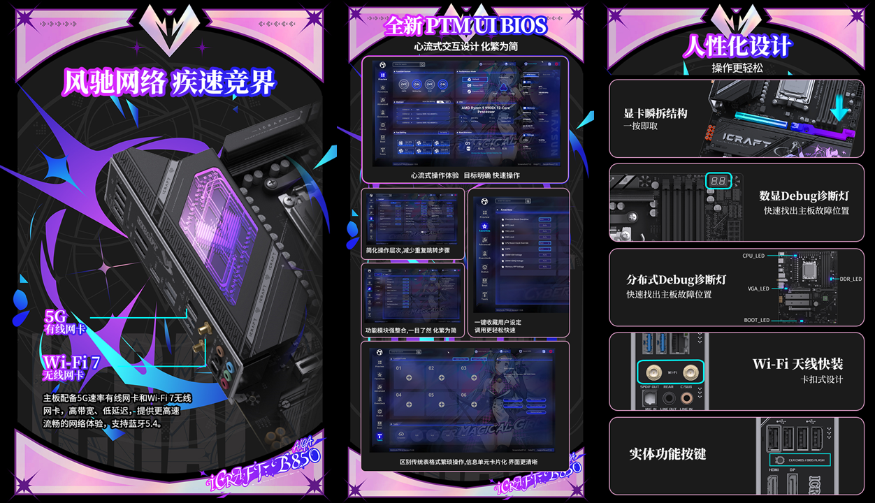 網(wǎng)絡(luò)體驗與操作便捷性上這款主板也毫不遜色。5G 速率有線網(wǎng)卡與 Wi-Fi 7 無線網(wǎng)卡的雙旗艦配置,搭配藍牙 5.4,無論是在宿舍連接校園無線網(wǎng)絡(luò),還是接入有線寬帶,都能實現(xiàn)高帶寬、低延遲的網(wǎng)絡(luò)傳輸,在線游戲?qū)?zhàn)時告別卡頓掉線,線上聽課、高清視頻會議、大型文件下載時流暢無阻。全新升級的 PTM UI BIOS 更是一大亮點,借鑒手機 APP 交互邏輯,將功能模塊化且交互層級精簡至 2 層以內(nèi),還特別加入璦珈魔術(shù)師形象,新手也能輕松完成 BIOS 調(diào)試;顯卡瞬拆結(jié)構(gòu)、Wi-Fi 天線快裝、數(shù)顯 Debug 診斷燈等 E-touch 人性化設(shè)計,讓裝機和調(diào)試過程告別繁瑣,省心又高效,小白也能輕松上手。