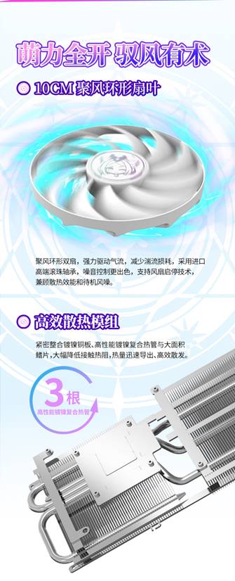 這款顯卡配備了10CM聚風環形扇葉,能集中氣流減少湍流損耗,采用進口高端滾珠軸承,噪音控制更出色,還支持風扇啟停技術,兼顧散熱效能和待機風噪。高效散熱模組緊密整合鍍鎳銅板、高性能鍍鎳復合熱管與大面積鰭片,大幅降低接觸熱阻,讓熱量迅速導出、高效散發,為穩定運行保駕護航。
