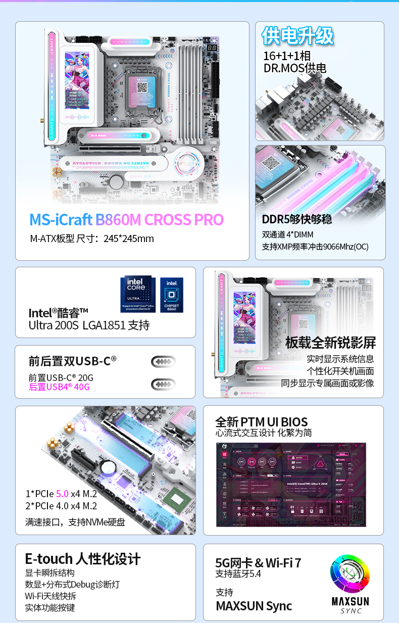 銘瑄 iCraft B860M CROSS PRO主板將次元美學(xué)與旗艦性能完美融合,全覆蓋藍(lán)粉漸變二次元紋路,3.4 英寸銳影 LED 顯示屏為核心亮點(diǎn),支持自定義開(kāi)關(guān)機(jī)畫(huà)面、桌面映射,搭配 MAXSUN View 軟件可解鎖無(wú)限個(gè)性化玩法,成為主機(jī)的 “個(gè)性門(mén)面”。供電采用 16+1+1 相 50A Dr.MOS 組合搭配 RT3638AE PWM 芯片,為新處理器提供澎湃且穩(wěn)定的電力輸出,高負(fù)載下依舊平穩(wěn)。4 條 DDR5 插槽擁有 9066(OC)MHz 的超頻潛能,完美兼容新處理器原生的 DDR5-7200 MT/s 內(nèi)存,專業(yè) PCB 優(yōu)化布線有效降低高頻信號(hào)損耗與串?dāng)_。拓展上配備 PCIe5.0 X16 合金裝甲插槽 + 3 個(gè)滿速 M.2 接口,滿足高端顯卡與高速存儲(chǔ)拓展需求;網(wǎng)絡(luò)同樣搭載 Wi-Fi 7+5G 有線的雙高速組合,搭配藍(lán)牙 5.4,保障全場(chǎng)景網(wǎng)絡(luò)體驗(yàn)。此外,顯卡瞬拆、Wi-Fi 天線快裝設(shè)計(jì),讓裝機(jī)與硬件升級(jí)更便捷。