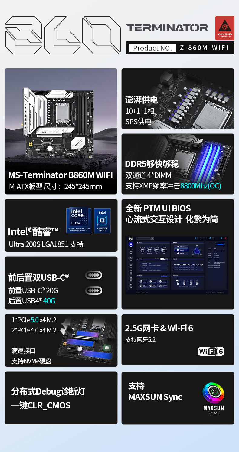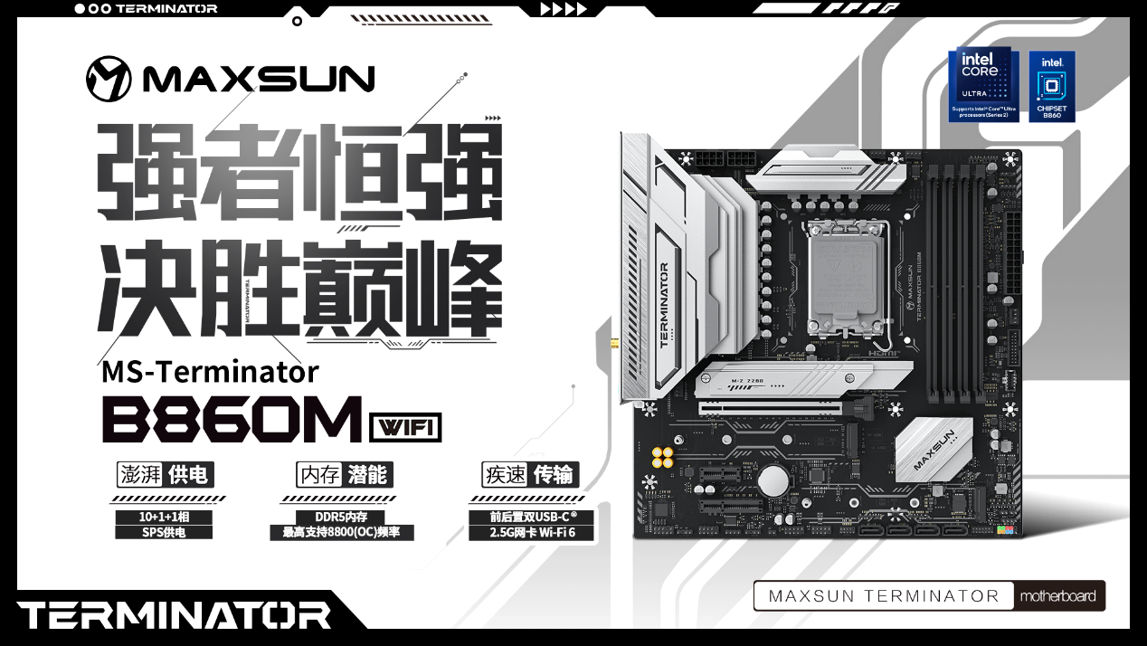 銘瑄 Terminator B860M WIFI主板采用 Micro-ATX 的板型,延續(xù)終結(jié)者系列經(jīng)典黑銀撞色設(shè)計(jì),低調(diào)中盡顯科技感,是入門(mén)裝機(jī)、設(shè)備升級(jí)的高性價(jià)比之選。供電采用 10+1+1 相 SPS 設(shè)計(jì),搭配大面積散熱裝甲與高品質(zhì)導(dǎo)熱硅條,為新處理器提供持續(xù)平穩(wěn)的電力輸出,滿負(fù)載下無(wú)卡頓掉幀問(wèn)題。4 條 DDR5 插槽支持 192GB 大容量與 8800MHz 超頻潛能,配合新處理器對(duì) CUDIMM 內(nèi)存的支持,大幅提升系統(tǒng)數(shù)據(jù)讀寫(xiě)與多任務(wù)處理能力。拓展性表現(xiàn)亮眼,PCIe5.0 X16 合金裝甲插槽為顯卡提供穩(wěn)固支撐,3 個(gè)滿速 M.2 接口(含 1 個(gè) PCIe5.0 x4)+ 多規(guī)格 PCIe 插槽,滿足硬件拓展與海量存儲(chǔ)需求;前后置雙高速 Type-C 接口實(shí)現(xiàn)疾速數(shù)據(jù)傳輸。網(wǎng)絡(luò)上配備 2.5G 有線 + Wi-Fi 6 無(wú)線網(wǎng)卡,搭配藍(lán)牙 5.2,有效避免網(wǎng)絡(luò)卡頓延遲,適配游戲、辦公、娛樂(lè)等多場(chǎng)景使用。