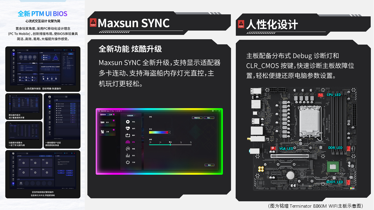 除了各有特色的硬核規(guī)格,銘瑄這四款主板均搭載全新 PTM UI BIOS,模塊化設(shè)計(jì)讓交互層級(jí)不超 2 層,新手也能輕松操作;同時(shí)配備分布式 Debug 診斷燈、CLR_CMOS 快捷按鈕,故障排查更省心,還支持 RGB 光效同步,可與外設(shè)聯(lián)動(dòng)打造個(gè)性化裝機(jī)氛圍,從操作便捷性到個(gè)性化設(shè)計(jì)實(shí)現(xiàn)全方位體驗(yàn)升級(jí)。